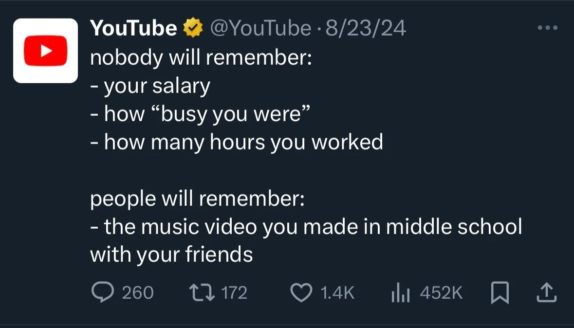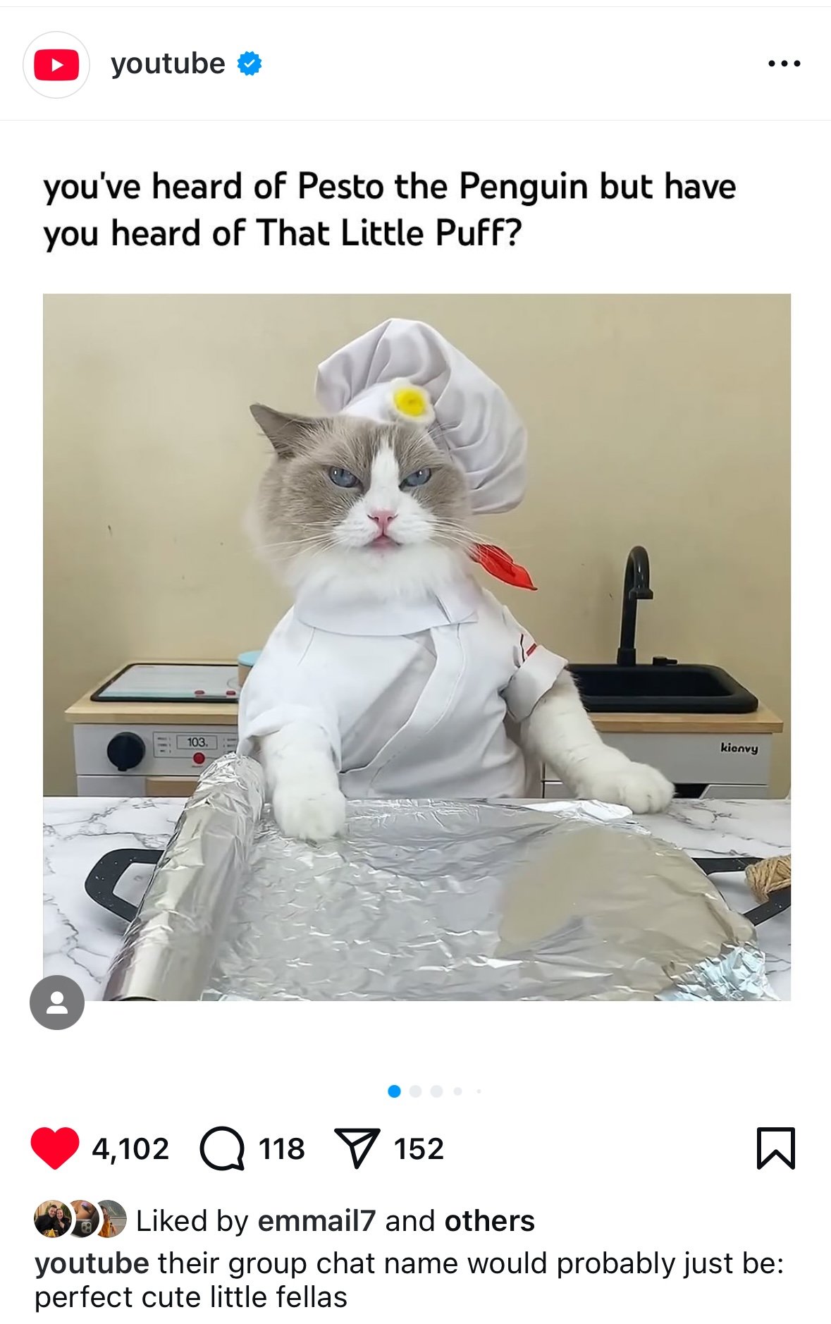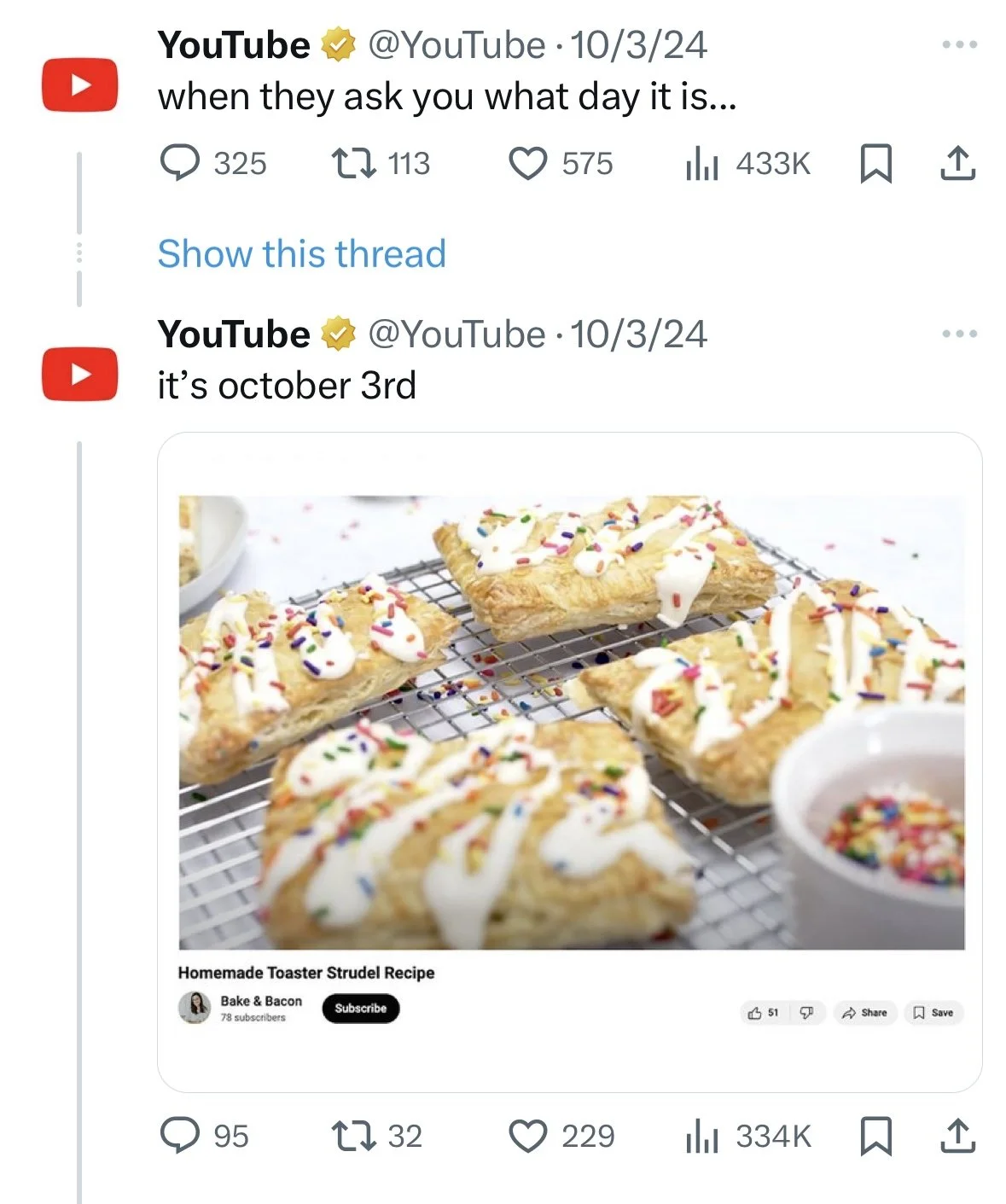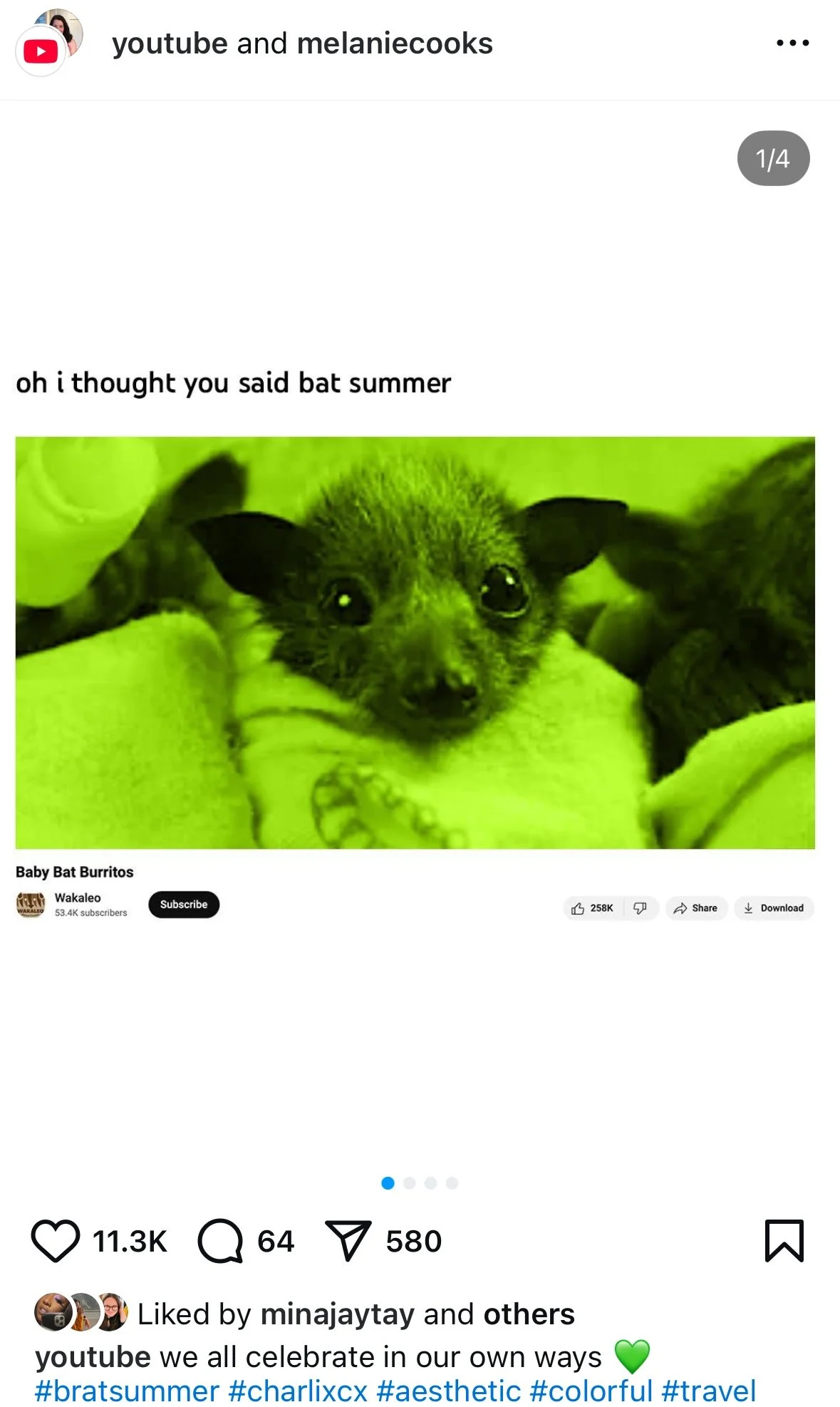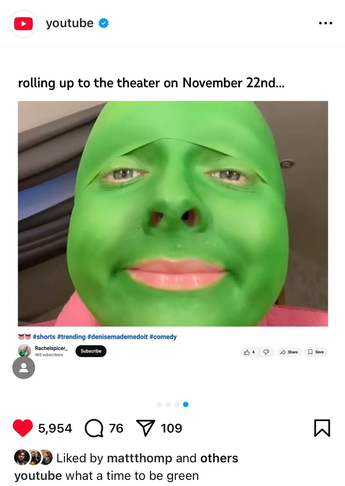 As the creative director across all of YouTube Social I oversaw creative strategy, tone of voice, creative direction, and partnerships across - YouTube’s YouTube Shorts, X, TikTok, Facebook, Instagram, Threads and YT Community Tab. I managed social rollout for all YouTube campaigns as well as evergreen content, reactive content and creator collaborations.